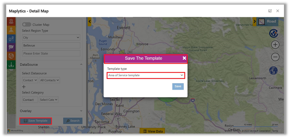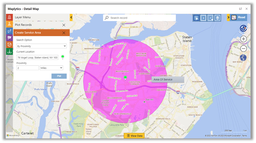 Using the Area of Service template, the user can see the records that lie within the created Service Area. For example, doctors can see patients' records which are falling under their service region.
