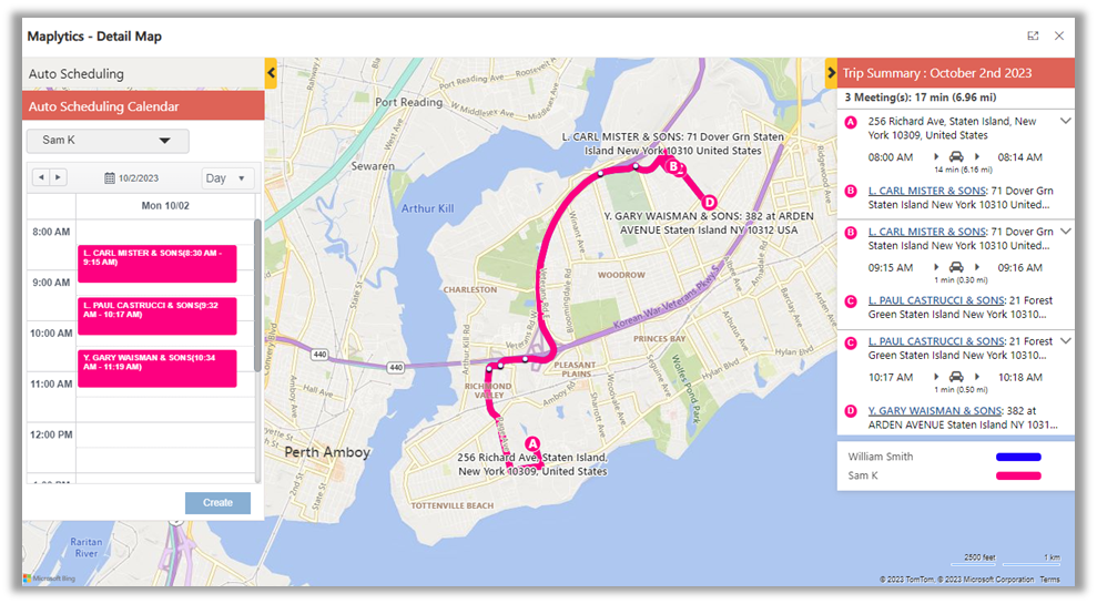 The Auto-Scheduling Calendar on the left shows the schedule for the day/week of different users. Each individual user can be selected and an optimized schedule for them will be displayed. The meeting details as well as the allotted time slots can be viewed. The user can choose from the drop-down option available on the tool bar of the Calendar panel and view the schedule for day/week. An optimized route corresponding to the schedule in the calendar is plotted over the map. Every user is automatically assigned a specific route legend and the route is displayed in user specific colors for easy readability.