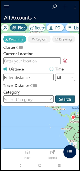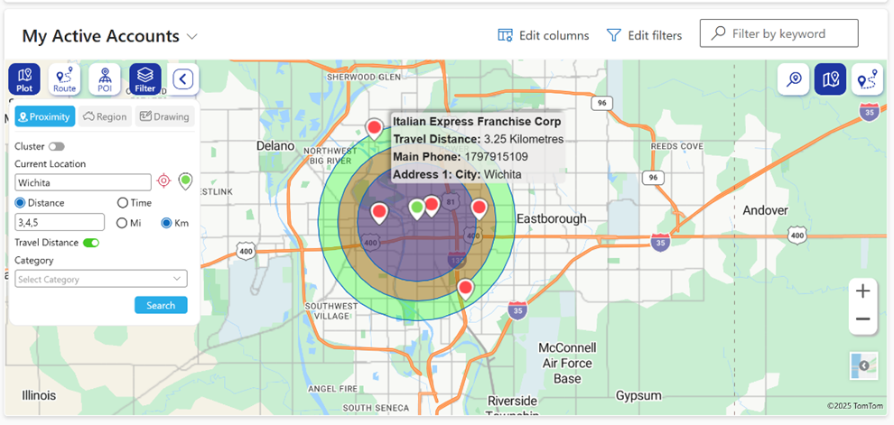 Once the user sets the current location, they can perform a Concentric Proximity Search and can look for the Travel Distance on the hover or the tooltip card for any record plotted within the specified proximity.