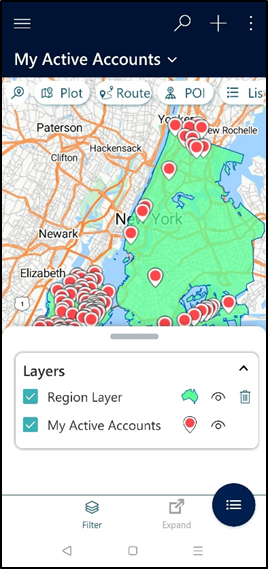 The filter option is used to filter the records and layers plotted on the map. In below reference the filter option has Layers Region Layer based on Region Search, My Active Accounts Layer of the plotted data.