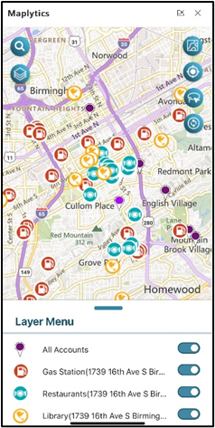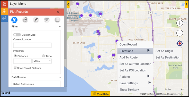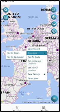Long press anywhere on the map to get a contextual menu on the map. The Pushpin Contextual menu provides the following additional options. This option provides commonly used features in Maplytics like Set as Current Location, Origin, Adding to Route, etc.