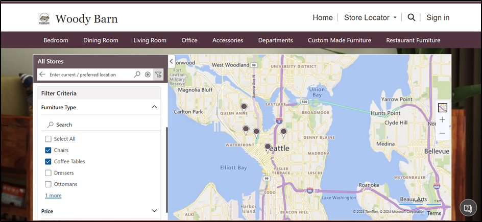 Ron can find a store using the Filter Criteria as well. He can filter out the stores based on the type of furniture he wants to buy. Here, he can select the checkboxes for Chairs, Coffee Tables, Dressers, Ottomans, Sofas, or all.