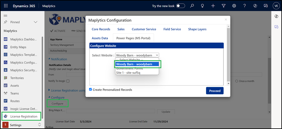 Once done with the Power Pages Configuration, the admin moves on to the Configuration Settings of Maplytics. Within Settings, the admin has to go to the *License Registration tab and click the Configure button within the Configure option*.