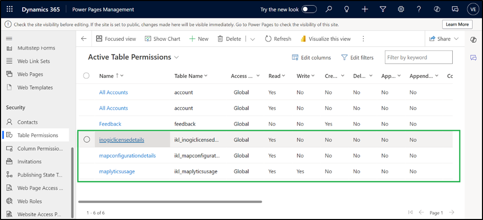 On clicking Proceed, 3 records get created at the bottom of the Table Permissions section in Power Pages Management signifying Inogic *License Details, Map Configuration Details, and Maplytics Usage Details*.