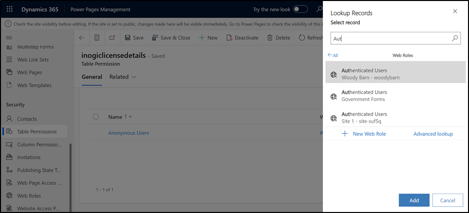 Table permissions need to be provided here as well. In each of the 3 records, first, a Web Role needs to be added.