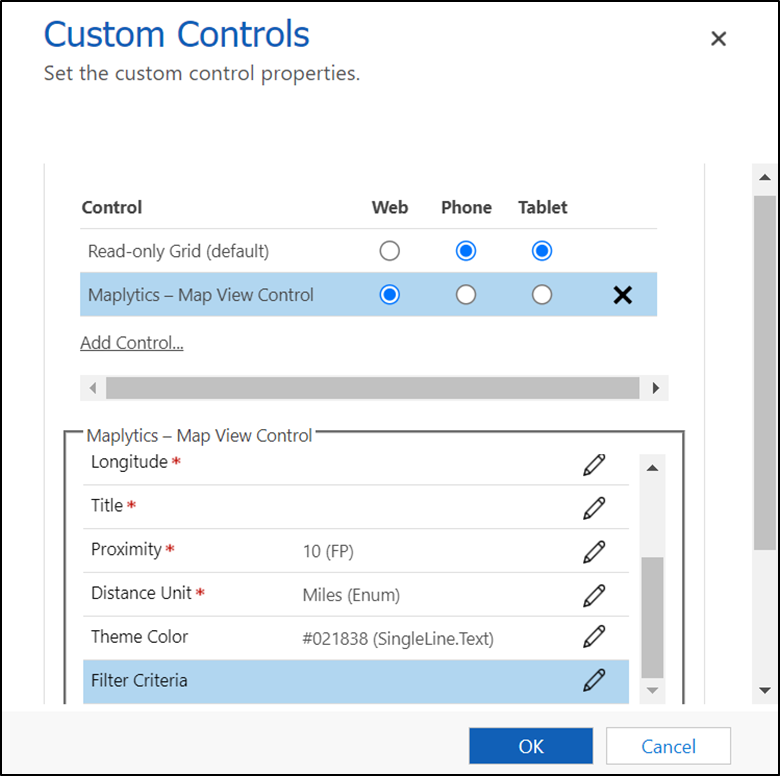 For the Maplytics Map View Control, some more parameters need to be passed as properties, some being mandatory and the rest being optional.