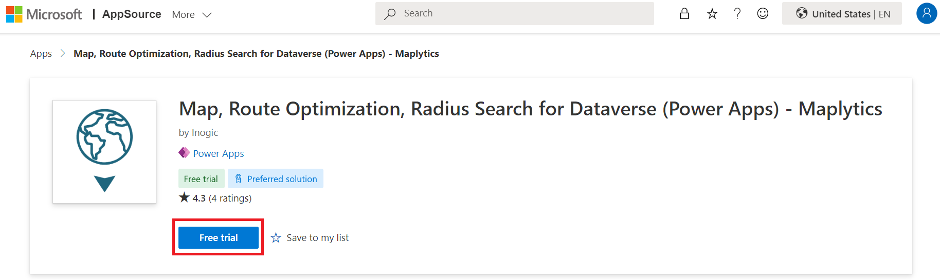 To install Maplytics solution from the Microsoft AppSource, [visit AppSource page](https://appsource.microsoft.com/en-us/product/dynamics-365/inogic.map-route-territory-powerapps) and follow the steps shown below.